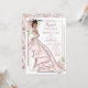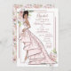 Une invitation à la douche nuptiale à fleurs roses présente une mariée pour être dans une robe mariage parties scintillant en or rose. Choisissez la couleur des cheveux et de la peau pour correspondre à la mariée.