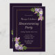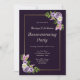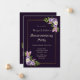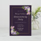 Une invitation à la fête à la floraison violette et lavande avec plumes roses et violettes et feuilles délicats de fougères vertes.