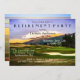Invitation de la fête de retraite avec un parcours de golf dans un magnifique paysage coloré. Sur le dos, vous trouverez un élégant design rayé (vous pouvez le remplacer par votre propre image si vous le souhaitez, ou choisir une couleur unie).