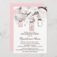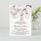 Invitation à une fête de fiançailles fantasque avec des fleurs roses et des jarres de mason. Parfait pour les fêtes de printemps.