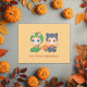 Bébés adorables habillés en costumes d'Halloween. Celui de gauche est habillé comme un dragon vert avec des pointes oranges. Celui de droite porte un costume de chat noir avec un gros arc orange. Un citrouille incurvé se tient entre eux et juste un peu derrière. Première invitation de fête d'Halloween pour les jumeaux bébés, n'importe quel sexe.