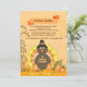 Une invitation mignonne montrant une dinde qui a des bonbons au maïs au lieu des plumes. La dinde utilise le casquette d'un pèlerin et est entourée avec des citrouilles, des tiges de maïs, le feuille de chute et des bonbons au maïs.