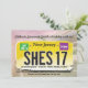 Une adolescente qui a 17 ans et qui obtient son permis de conduire est une étape importante à célébrer ! J'ai créé ce design pour capturer la plaque d'immatriculation de l'état et la mettre sur le dessus d'un arrière - plan mou qui comprend la rue, l'autoroute et le ciel. Ce design résume rapidement votre fête d'anniversaire. C'est au point, mais dans un design amusant qui dit tout. Votre adolescente est sur le point de prendre la route !