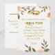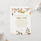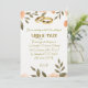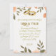 Invitation de mariage représentant des fleurs de couleur saumon frais ornées de feuilles vertes et montrant une paire d'anneaux dorés sur la carte.