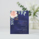 Un fond de couleur bleu marine. La couleur bleue est inégale. Décoré avec une fleur rose or et rose blush, une fleur de rose et des feuilles d'eucalyptus aquarellées vertes, des brindilles, de la verdure et une brindille dorée factice. Personnalisez et ajoutez vos noms et détails. Texte de couleur blanche et dorée.
