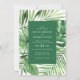 Invitation de mariage à l'aquarelle avec feuille tropicale et écriture. Texte manuscrit peint à la main. Fait partie d'une collection estivale tendance. La couleur de fond peut être modifiée.
