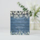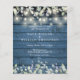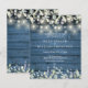 Une invitation de mariage rustique et économique présentant de jolies guirlandes lumineuses et des feuilles de sauge et de lilas qui tombent sur un fond de panneaux de bois rustique bleu et vos coordonnées de mariage dans un texte classique élégant. Conçu par Thisisnotme©