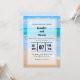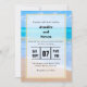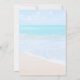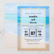 Une invitation de mariage de destination avec une photographie d'une scène d'océan bleu clair avec des vagues douces le long d'une côte et du sable brun doux. Un ciel bleu avec des nuages duveteux au loin. Lieu tropical serein et idyllique.