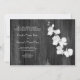 faire-part de mariage avec une image arrière - plan en noir et blanc d'orchidées blanches au-dessus du bois d'écorce. Personnalisez avec les détails de votre événement à gauche. L'écriture est celle des parents de la mariée.