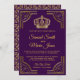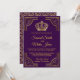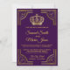 Étonnez vos invités avec ce carton d'invitation de mariage sur le thème royal, doté d'une bordure dorée élégante et d'une belle couronne sur fond violet foncé. Ajoutez simplement les détails de votre événement à ce modèle facile à utiliser pour en faire une invitation unique. Retournez la carte pour révéler un beau motif au verso. Cette invitation est entièrement personnalisable. Tous les textes sont modifiables et la couleur de fond peut être facilement modifiée pour s'adapter à vos préférences.