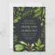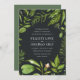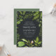 Notre invitation de mariage de Midnight Garden entoure vos détails de jour de mariage avec une aquarelle peinte verdure dans les tons luxuriants de vert de printemps, d'olive et de fougère. Un choix moderne et bio pour les mariages du printemps ou de l'été avec des feuilles verts frais et des tiges dans Greenery, couleur de l'année 2017, sur un élégant et dramatique arrière - plan brossé hors noir.