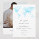 Vous planifiez un mariage à destination ? Lancez-vous avec votre invitation de mariage de destination moderne avec votre région mariage sur une carte du monde de l'aquarelle. Le design d'invitation de mariage de destination FERNANDA présente un design moderne avec une carte du monde bleu aquarelle, jumelée à des polices sans serif modernes et des polices manuscrites pour ajouter un intérêt visuel dans le noir riche. Cette invitation do-it-yourself mariage de voyage donne le ton pour votre mariage de destination pour le couple amoureux du voyage. Une photo du couple avec leurs noms et le site internet mariage avec tous les détails du voyage est incluse à l'arrière de l'invitation de mariage de destination simple.