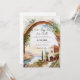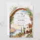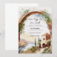 Cette invitation de mariage présente un paysage grec d'une structure construite sur une falaise surveillant la mer Méditerranée près des heures du coucher du soleil. Le design intègre également la structure locale de l'archipel du lieu.
