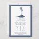 Une faire-part de mariage simple et moderne avec une illustration bleu foncé d'une île avec deux palmiers. Bordure, texte personnalisé et côté opposé sont également bleus.