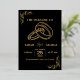Invitation de mariage élégante noire et dorée à motif feuille d'or. Un cadre doré orné et des ornements décorent un fond noir foncé élégant pour un effet dramatique