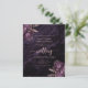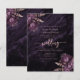 Cette élégante invitation de mariage présente des bouquets floraux violets mis en valeur avec de la verdure en faux feuillet rose gold dans deux coins, sur une image de fond d'agate aquarelle violette. Le texte rose personnalisable combine des polices serif, italique et manuscrites. Le verso présente un design floral et agate violet et rose gold assorti.