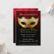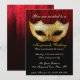 Invitation de mariage masqué élégante. Une invitation élégante et raffinée présentant un masque de mascarade doré avec des fioritures noires, un fond de ton canneberge avec un motif damassé subtil se fondant dans du texte noir et élégant qui est personnalisable pour les détails de votre soirée.