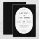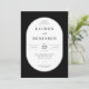 Cette élégante invitation de mariage présente un design classique et minimaliste avec une palette de couleurs monochromes constituée de texte noir sur fond blanc. La mise en page est centrée autour d'un cadre ovale, créant une composition équilibrée et symétrique qui met en valeur les lignes épurées et la typographie nette. Les polices serif ajoutent de la sophistication, tandis que l'espace négatif généreux améliore la lisibilité et la concentration, ce qui la rend parfaite pour les occasions formelles. L'esthétique simple et sans encombrement transmet une atmosphère d'élégance et de simplicité, idéale pour les couples qui recherchent un look intemporel et raffiné pour leur jour spécial.