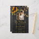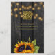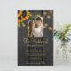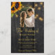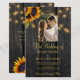 Faire-part de cérémonie de mariage à la campagne rustique et réception élégante, modèle de budget élégant et abordable sur fond de bois de grange brun foncé avec photo en forme d'arche et code QR de numérisation pour répondre en ligne avec des bouquets de tournesols jaunes dorés, des guirlandes de lumières scintillantes et une typographie dorée chic. +++++++++++ Facile à personnaliser avec vos détails ! ++++++++++++ Le faire-part convient aux mariages rustiques à la campagne, dans le jardin ou dans la cour arrière.