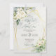 Modèle floral à cadre géométrique en or de rose blanche, eucalyptus faire-part de mariage avec code RSVP QR à l'arrière.
