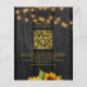 Élégant modèle de faire-part de mariage d'été ou d'automne chic et stylé à petit budget avec RSVP en ligne sur bois de grange brun foncé mettant en vedette de beaux tournesols orange rouille et jaune or et des guirlandes ou des lumières scintillantes. Facile à personnaliser avec vos informations et un code QR généré automatiquement pour votre site web ou tout autre lien en ligne.