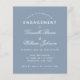 Une simple invitation de fête de fiançailles avec une couleur moderne : bleu poussiéreux. Il n'y a que du texte blanc sur fond bleu poussiéreux. Les noms sont écrits dans un script calligraphique élégant, le reste en majuscules. la première ligne est un texte arqué.