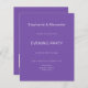 Faire-part de mariage moderne et simple avec code QR pour soirée de mariage violet. La couleur et le type de police peuvent être modifiés via le menu d'édition. Vous pouvez également modifier les couleurs du texte et de l'arrière-plan de chaque côté si vous le souhaitez. Une valeur pour de l'argent plus petite de 4,5 x 5,6 pouces par défaut sur l'option semi-brillant qui est recommandée pour les invitations et a une épaisseur similaire à une carte postale. L'option satin est beaucoup plus fine. Ajoutez votre code QR à votre site web de mariage au dos comme une option pratique pour que vos invités répondent. Les codes QR peuvent être créés gratuitement en ligne. Il suffit de rechercher « créateur de code QR » et de sélectionner l'un des créateurs gratuits. Vous pouvez également supprimer le code QR si vous le souhaitez.