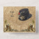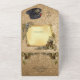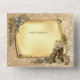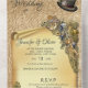 Sculptures Steampunk en or et laiton sur texture de cuir doré froissé avec un vieux parchemin jaune brûlé et sculptures steampunk et chapeaux pour le couple de mariés.