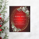 Arrière - plan de dégradé rouge. Un cadre ovale en faux or décoré de cônes, de berres blanches et de végétation en pin. Personnalisez et ajoutez les détails. Texte blanc. 1 feuille = 1 invite imprimé bord à bord.