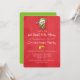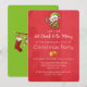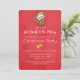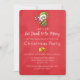 Une invitation de fête de Noël festive avec un elfe mignon tenant une canne de bonbon rayée rouge et blanc. Le texte est séparé par une paire de cloches dorées. Sur un fond rouge vif de Noël.