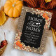 Cartes d'invitation de pendaison de crémaillère rustiques avec un fond en bois chic de campagne, un centre de tableau noir, une corde, des citrouilles d'Halloween, du feuillage d'automne, des glands, une dispersion de feuilles d'automne, des guirlandes lumineuses, la phrase mignonne "maison douce maison" et un modèle de texte d'invitation de fête personnalisé.