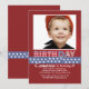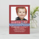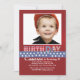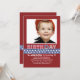 Une invitation délicieuse avec un thème patriotique. L'arrière - plan rouge audacieux a un bleu, étoile-a orné la bande et les mots de paillettes de "JOUR de NAISSANCE" de coutume. Ajoutez juste votre photo préférée pour lui faire le vôtre ! (Point de gel)