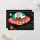 Une invitation colorée comportant un vaisseau spatial avec une fenêtre, des planètes et des étoiles de photo à un arrière-plan noir. Une invitation délicieuse pour votre partie d'espace-thème.