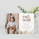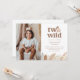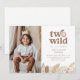 Cette invitation d'anniversaire présente un doux visage de lion à l'aquarelle avec la phrase "deux sauvages", accentué par des feuilles de jungle de ton neutre le long du bas. Vous pouvez également ajouter votre propre photo du garçon ou de la fille qui fête son anniversaire. Parfait pour une célébration de deuxième anniversaire sur le thème du safari !