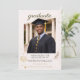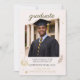 Thème de portrait académique avec des accents dorés chauds sur un fond crème doux, présentant une photo de diplômé centrée encadrée par des détails de confettis subtils et de petites icônes savantes. La typographie script et serif se combine avec une mise en page épurée adaptée aux annonces de fin d'études universitaires et aux rassemblements de célébrations sur le campus.