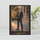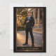 Conception de portrait en or noir comportant une photo officielle de diplômé encadrée par une double bordure dorée avec des accents de lumière douce. La typographie script se marie avec un fond texturé sombre, idéal pour organiser une célébration élégante en soirée avec dîner, boissons et danse.