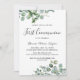 Marquez cette occasion sacrée avec élégance et grâce. Cette invitation de première sainte communion de milieu d'été présente un design botanique luxuriant avec de l'eucalyptus aquarelle magnifiquement peint et des feuilles vertes vibrantes. Parfait pour une célébration raffinée et sincère.