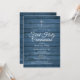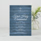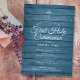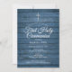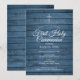 Une invitation de première communion rustique comportant vos détails personnalisés spéciaux dans une typographie chic sur un fond de panneaux de bois bleu. Conçue par Thisisnotme©