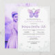 Une invitation simple et élégante pour la Quinceañera. Présentant un papillon lilas avec une couronne argentée entouré d'une bordure de jardin qui permettra à vos invités de trouver facilement toutes les informations nécessaires pour votre grand événement. Les chiffres romains "XV" représentent les 15 printemps de la fêtée. Le verso est l'endroit idéal pour mettre une photo de la belle Quinceañera.