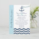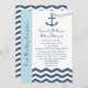 Cette invitation de réception après mariage a un thème nautique et comporte les mots "Réception après mariage" sur la gauche sur une bande bleu clair, mais le point central du design est une ancre avec une chaîne en forme de cœur jetée dans une mer en chevron ou en zigzag. Vous pouvez personnaliser l'invitation avec le nom de la mariée et du marié, la date et le lieu du mariage et tous les détails de votre invitation de réception après mariage. Copyright henishouseofpaper