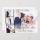 Faire-part de mariage ou d'annonce de mariage privé élégant avec une photo de votre jour de mariage superposée d'une bande de trois photos carrées plus petites et "Heureux à jamais" dans un script moderne élégant. Ajoutez vos prénoms, date de mariage et lieu en typographie simple. Au verso, personnalisez votre faire-part de mariage et votre invitation de réception et ajoutez vos noms dans un script ressemblant à une signature.