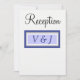 Cartes de réception de mariage élégantes avec monogramme blanc et pervenche. Personnalisez les initiales des mariés dans une écriture pervenche foncée à l'intérieur d'un cadre argenté et pervenche. Le verso des cartes comporte une grande initiale monogrammée du nom de famille du marié en texte argenté. Personnalisez le verso de la carte de réception avec vos détails de mariage. Imprimé sur du papier lin élégant. Création originale de TamiraZDesigns.