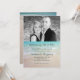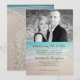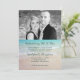 Faire-part de mariage et invitation avec un thème plage / tropical pour la réception uniquement. "Voici M. et Mme" est la première ligne sous la grande photo des jeunes mariés. L'image de l'eau de l'océan bleu et du sable de la plage est le fond des polices écrites en grande écriture et en petites lettres majuscules. Tout d'abord, annoncez la date et le lieu du mariage, puis invitez les invités à la réception.