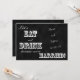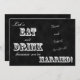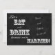 Cette invitation de réception après mariage présente un design de tableau noir et blanc avec les mots "Mangeons et buvons parce que nous sommes mariés !" sur le devant, ainsi qu'un espace pour "écrire" vos noms en biais sur le tableau, ainsi que la date de votre mariage. Au verso de l'invitation de réception après mariage figurent les noms de la mariée et du marié avant le mariage, ainsi que le lieu de la cérémonie et les détails de la réception. Une façon moderne et amusante d'inviter vos invités à une réception après mariage. Copyright henishouseofpaper