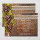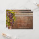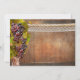 Une invitation de réception de mariage sur le thème du vin, après la cérémonie de mariage, avec une vigne et des raisins sur fond de tonneau de vin en bois, ornée de dentelle et de corde. Parfaite pour une célébration dans un vignoble ou une winery.