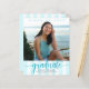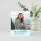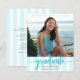 Soyez fier, réjouissez-vous et annoncez au monde que votre diplômé préféré a atteint son objectif avec cette invitation de annonce de budget personnalisée, simple, moderne et époustouflante. Une écriture calligraphique pailletée, élégante et faussement turquoise, une typographie grise sans empattement et une photo de votre choix se superposent sur un fond rayé bleu turquoise clair et blanc. Personnalisez le texte personnalisé avec le nom de votre diplômé, le nom de l'école, l'année de la promotion et la date de la remise des diplômes. Au verso, ajoutez votre note personnelle, l'école suivante qu'ils fréquentent, les informations sur la fête, etc. Garantit d'ajouter une touche de style amusant à leur occasion spéciale !