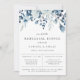 Arrangement floral à l'aquarelle dans des nuances de bleu poussiéreux et de marine, invitation au dîner de répétition. Conception de typographie chic et moderne. Le dos de la carte présente une couleur bleu poussiéreux uni.