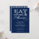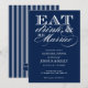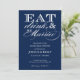 Cette invitation de dîner de répétition élégante présente la phrase "Mangez, buvez et soyez mariés" en typographie grasse.