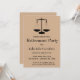 Cette carte d'invitation modifiable présente les balances de la justice sur un fond marron. Ci-dessous se trouvent les détails modifiables de l'événement. Cette carte est présentée pour la retraite d'un juge, mais elle peut également être utilisée pour n'importe quelle raison pour célébrer (diplôme, nouvel emploi, promotion, retraite) pour toute profession juridique.