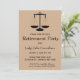 Cette carte d'invitation modifiable présente les balances de la justice sur un fond marron. En dessous se trouvent les détails modifiables de l'événement. Cette carte est présentée pour la retraite d'un juge, mais elle peut également être utilisée pour n'importe quelle raison pour célébrer (diplôme, nouvel emploi, promotion, retraite) pour toute profession juridique.